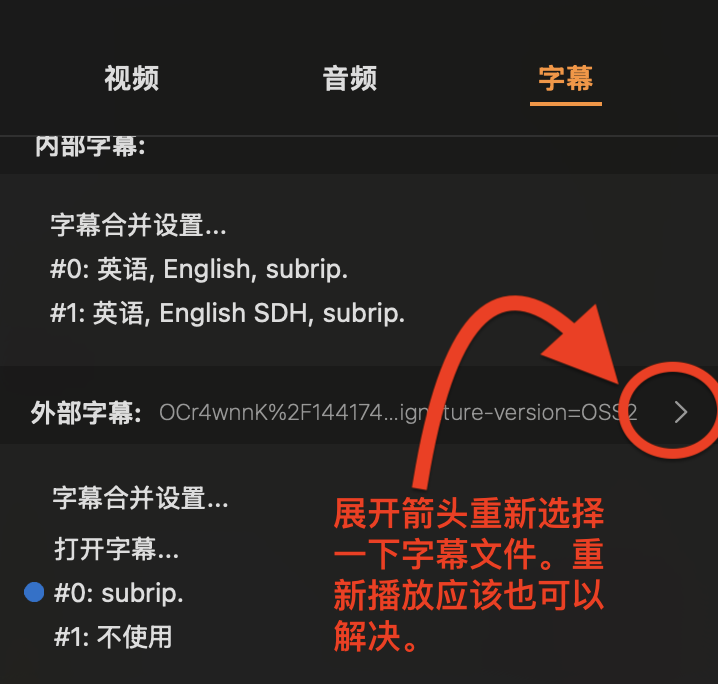 你好,关于字幕的bug, 根据描述应该是在线视频,在线视频在拖动进度条后,可能会出现这个问题,原因主要是1.网络问题导致读取字幕失败,只需要在右边栏“快速设置”->字幕->外部字幕找到该字幕文件,选择一下就可以了;2.某些网盘(如阿里云)对资源的访问次数有限制,如果你多次拖动就会产生多次访问,某些时候就会被造成读取字幕文件时被拒绝,此时需要等待30秒左右,再如前面所述重新选择一下该字幕进行加载,另外不使用拖动而是直接点进度条试试。